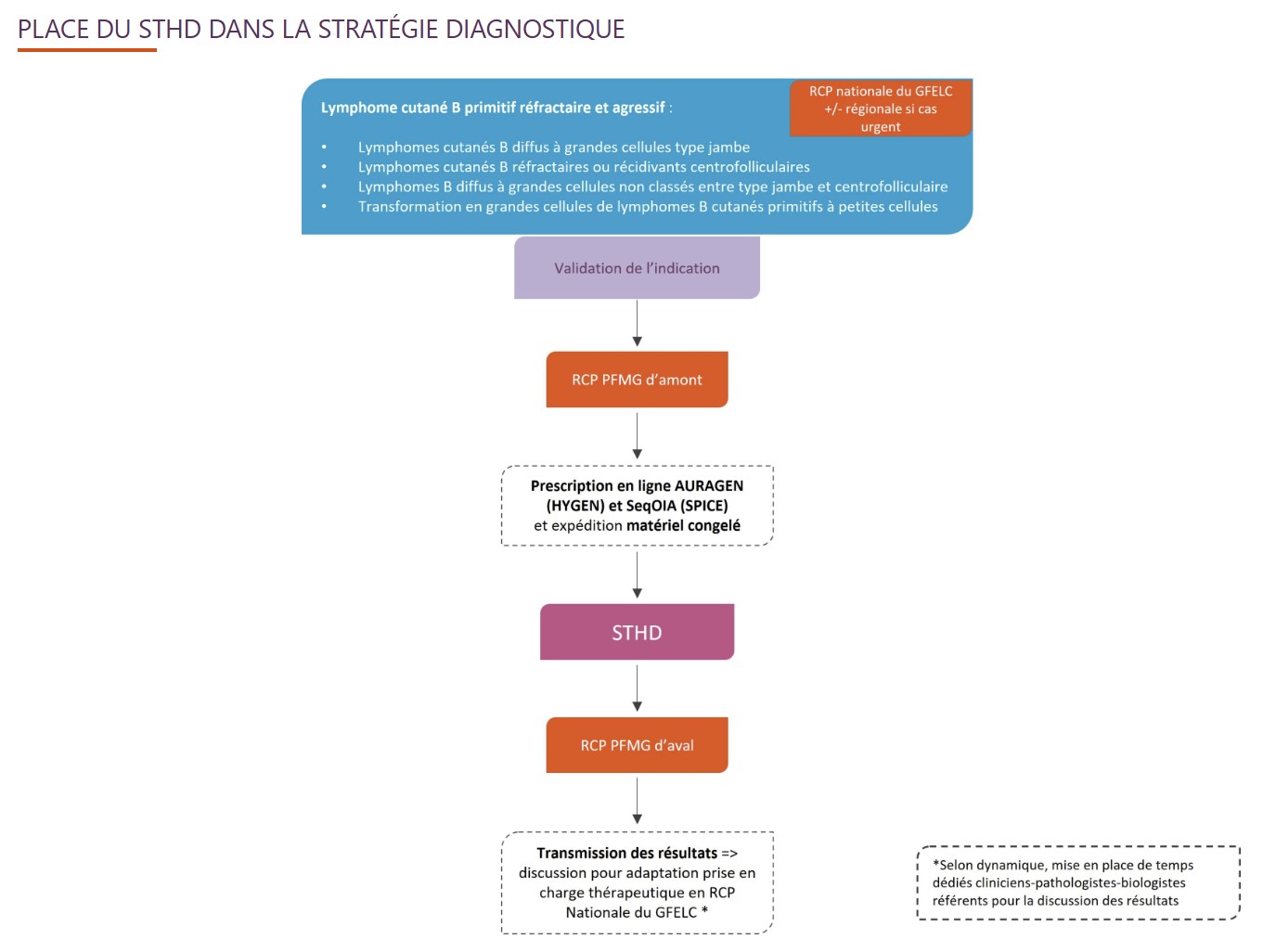 Un travail porté par l’équipe de Bordeaux au nom du GFELC a permis de proposer via le Plan France Médecine Génomique 2025 le séquençage très haut débit dans les lymphomes B cutanés primitifs réfractaires ou récidivants. L'utilisation du séquençage de très haut débit aurait plusieurs avantages : permettre une complétude d’analyse, l’accès potentiel à des molécules innovantes, utilisées en particulier dans des lymphomes systémiques, amenant à leur repositionnement, mais aussi de permettre de participer et/ou proposer des essais cliniques thérapeutiques institutionnels (GFELC, EORTC ...) incluant cette analyse. Deux RCP-moléculaires ont été identifiées correspondant à chacune des plateforme AURAGEN et SeqOIA respectivement à Bordeaux et Paris-St Louis.